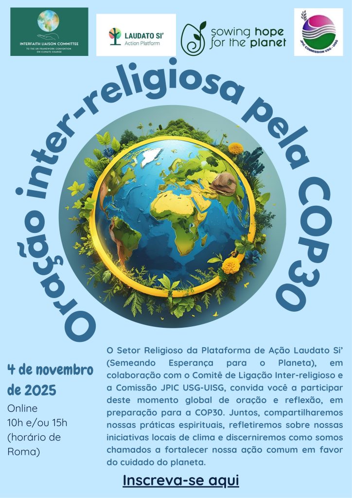 O Setor Religioso da Plataforma de Ação Laudato Si’ (Semeando Esperança para o Planeta), em colaboração com o Comitê de Ligação Inter-religioso e a Comissão JPIC USG-UISG, convida você a participar deste momento global de oração e reflexão, em preparação para a COP30. Juntos, compartilharemos nossas práticas espirituais, refletiremos sobre nossas iniciativas locais de clima e discerniremos como somos chamados a fortalecer nossa ação comum em favor do cuidado do planeta.