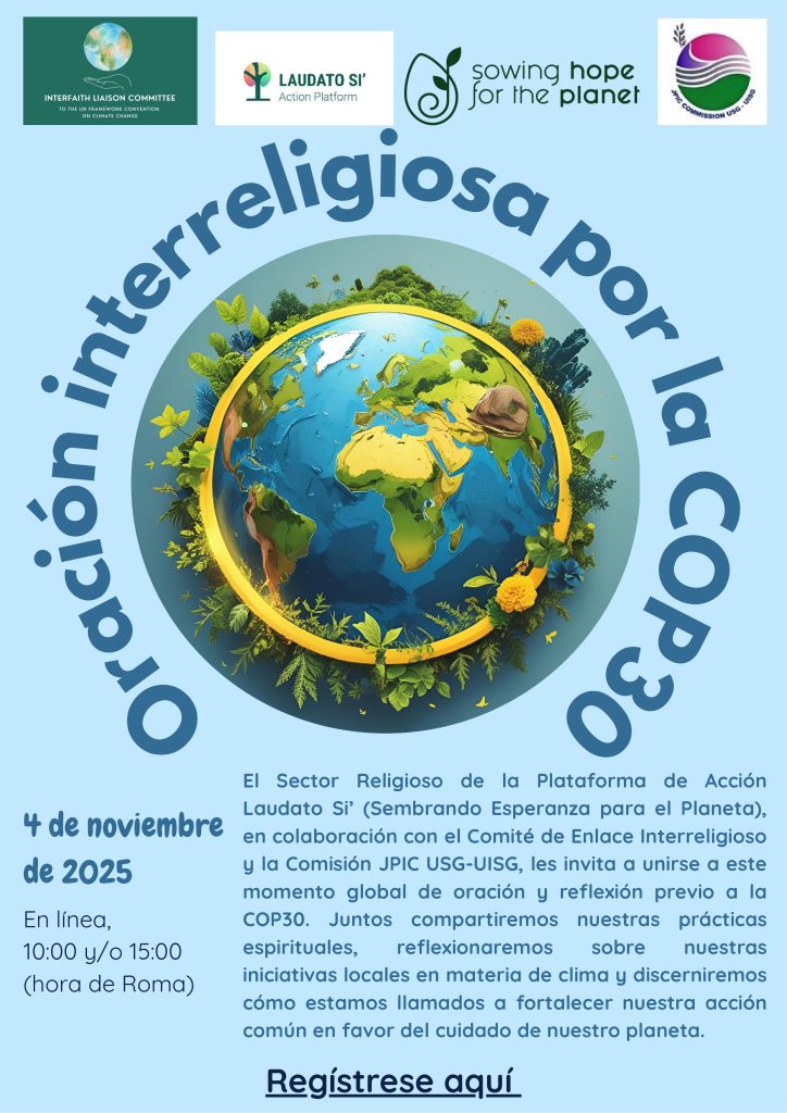 El Sector Religioso de la Plataforma de Acción Laudato Si’ (Sembrando Esperanza para el Planeta), en colaboración con el Comité de Enlace Interreligioso y la Comisión JPIC USG-UISG, les invita a unirse a este momento global de oración y reflexión previo a la COP30. Juntos compartiremos nuestras prácticas espirituales, reflexionaremos sobre nuestras iniciativas locales en materia de clima y discerniremos cómo estamos llamados a fortalecer nuestra acción común en favor del cuidado de nuestro planeta.