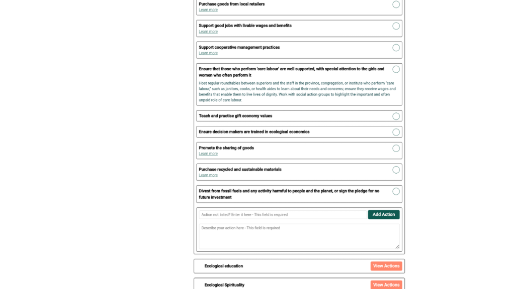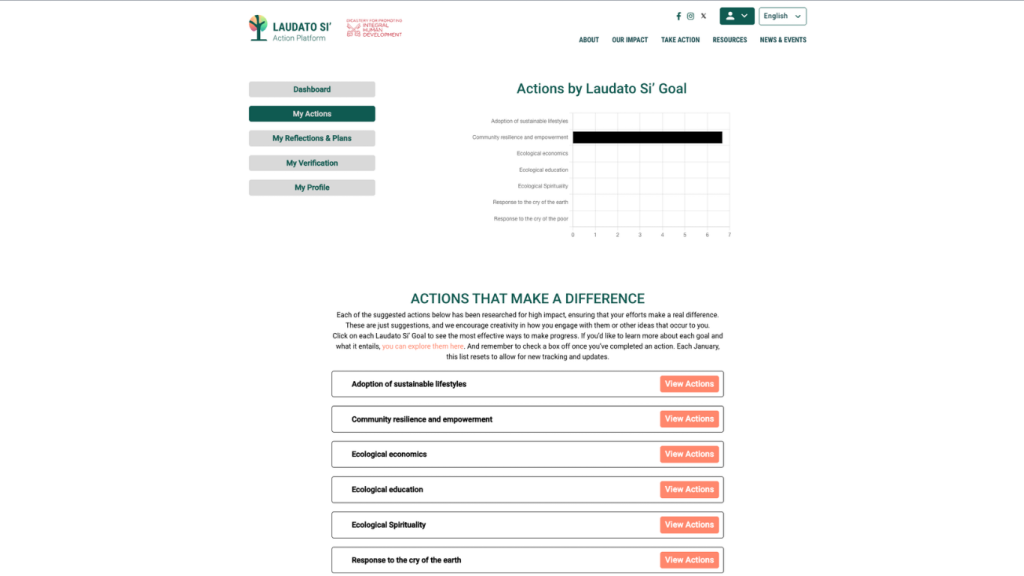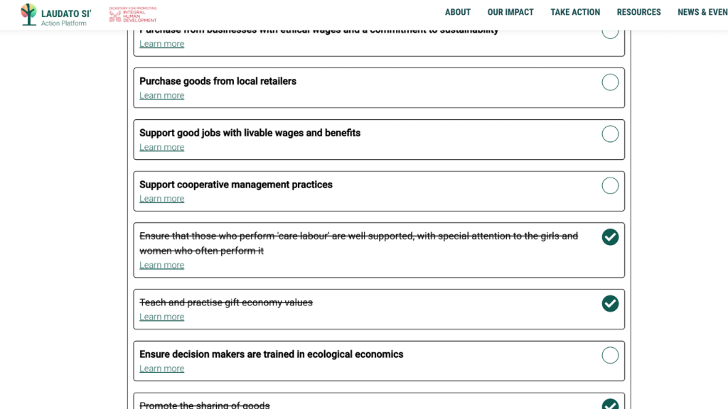 Now you will see actions grouped under goals inspired by Laudato Si’, such as:
