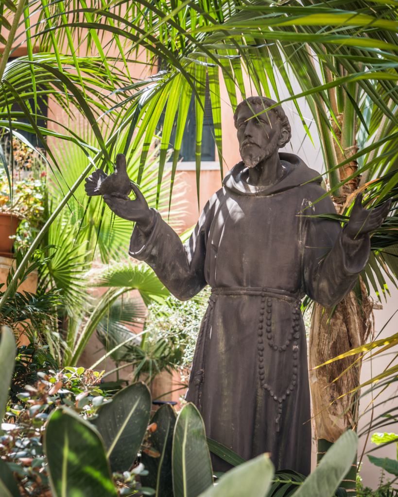 A statue of St. Francis holding a dove at the Catholic Cathedral of the Assumption of the Blessed Virgin Mary in Chania, Greece.